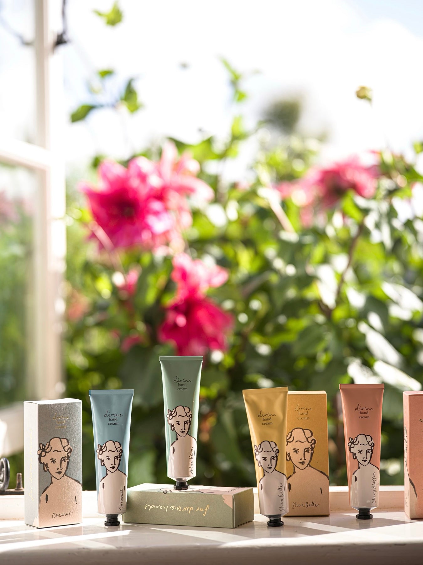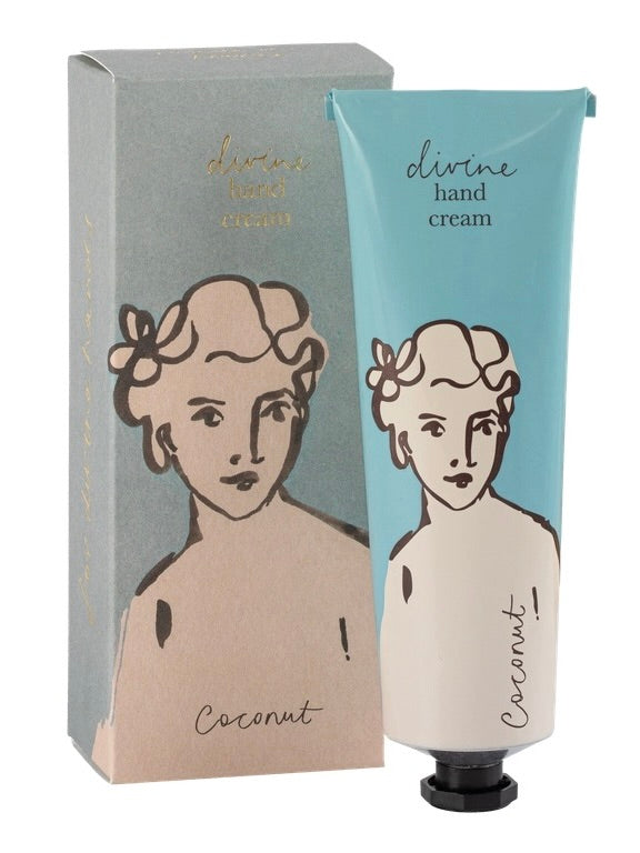 This beautifully formulated, coconut scented hand cream arrives in a soft blue tube adorned with The Divine Lady illustration by small business Wanderlust, and is presented in a matching blue box finished with elegant gold foil details.