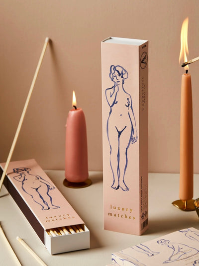 These beautiful letterpress boxes contain long, white tip matches. A stylish way to display and light your candles.