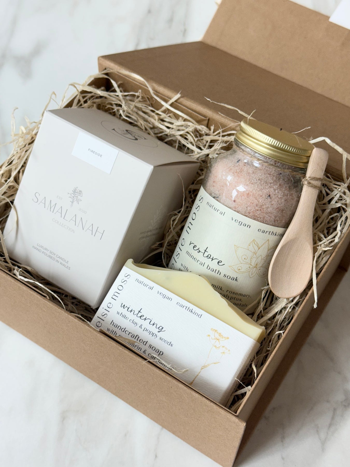 Each hamper is beautifully hand-packed in our branded kraft gift box, with every item nestled in soft, biodegradable wood wool. Finished with an organic cotton ribbon and a sprig of dried foliage, it’s a gift that feels as indulgent as it looks... perfect for creating a spa-like sanctuary at home.